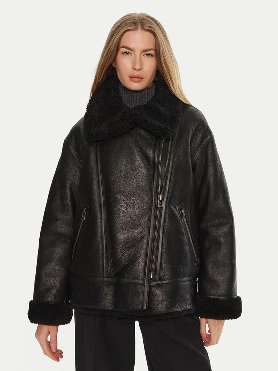Serge Pariente Dabisks ādas kažoks Christelle Melns Regular Fit